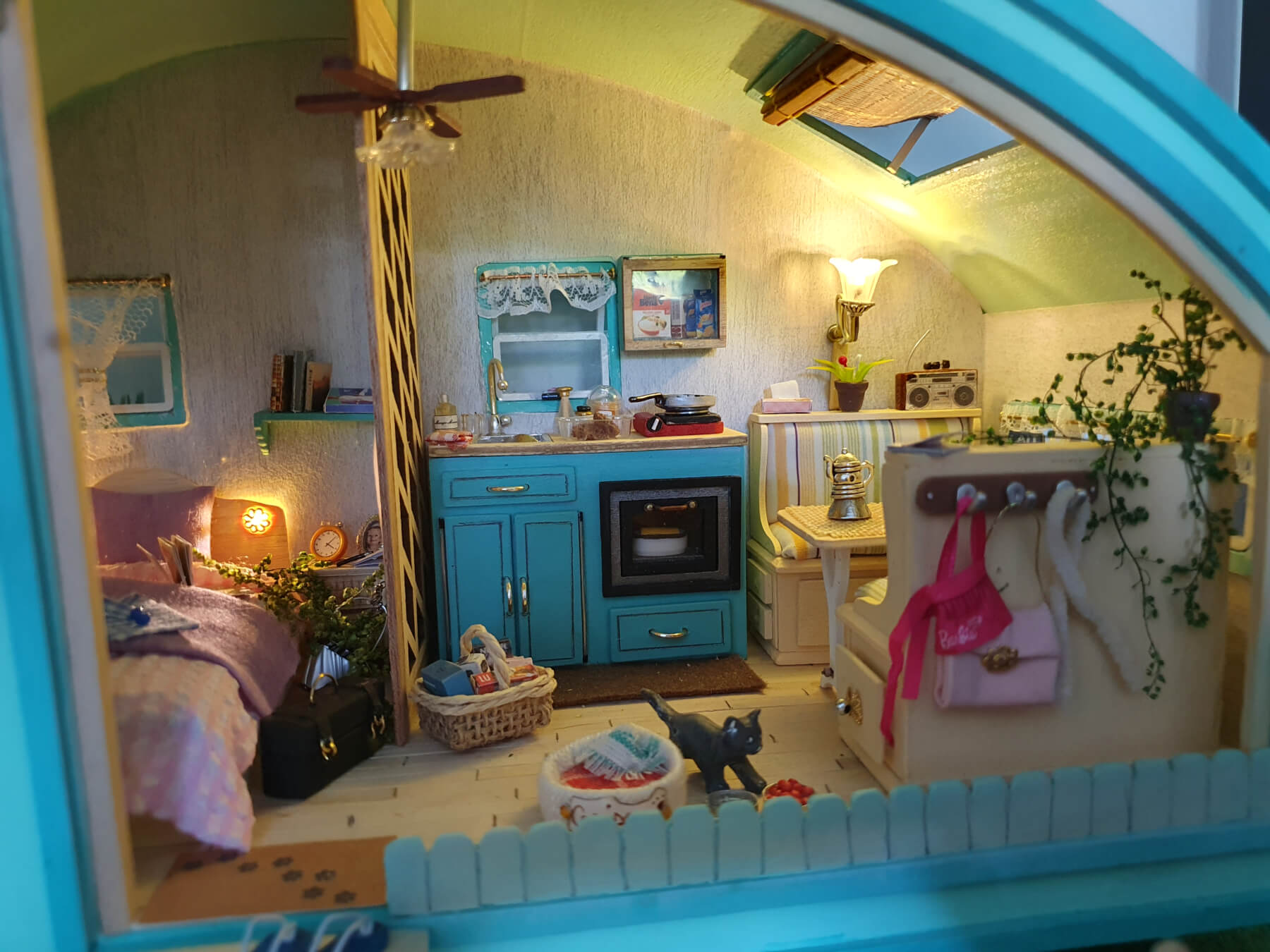Impossible de trouver la solution, rien n'allait. Et à force de chercher et de chercher, on est tombé sur une boîte à chapeau. On l'a découpée en 2 et le tour était joué. Il a suffit de trouver une boîte à la dimension souhaitée. Après, d'autres difficultés sont apparues. Eclairage, coussins des banquettes, fenêtre de toit....On a commencé en septembre et on vient de la terminer.